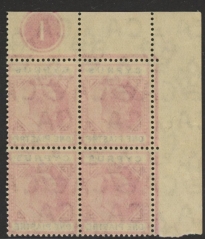 1904 Cyprus SG.64 1pi carmine & blue. top corner plate block of 4 . U/M (MNH)